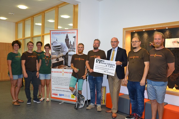 7.371 Euro. Das ist die unglaubliche Summe, die viele Freunde und Förderer gespendet haben, um unsere Akteure beim selbstständigen Imkern zu unterstützen. Knapp 1.300 € hat die Mainzer Volksbank dabei zugeschossen. Uwe Abel, Vorstand der MVB, zeigte sich bei der Scheckübergabe in der Sozialen Stadtimkerei (23.07.) begeistert: „Eine Idee, die der genossenschaftlichen so naheliegt, gilt es zu unterstützen.“ Auch Marketingleiter Peter Jost war vom imkerlichen Knowhow der Akteure bei der anschließenden Führung beeindruckt. Ein Drittel der Spende konnten die Akteure bereits in eigenes, imkerliches Equipment und einen zusätzlichen Kurs zur Ablegerbildung investieren. Auch an dieser Stelle nochmal allen UnterstützerInnen ein herzliches Dankeschön!