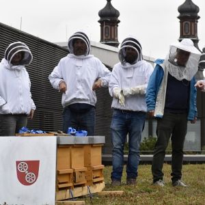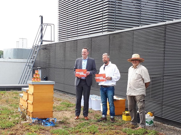 Ein weiterer Standort befindet sich in der Großen Bleiche auf dem Dach des neuen Stadthausdomizils. Von hier aus starten unsere Bienen, um Nektar und Pollen zu sammeln. Der Rhein bildet übrigens eine natürliche Grenze, Bienen meiden das Überfliegen von großen Gewässern. Ein Namenswettbewerb brachte diesen schönen Honignamen hervor: GRAND MAYENCE.