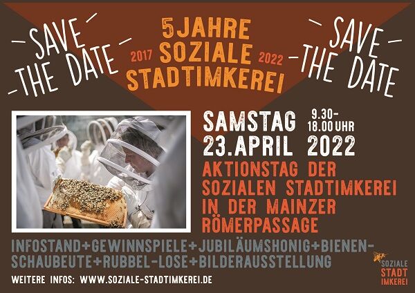 In der Mainzer Römerpassage werden wir anlässlich unseres kleinen Jubiläums einen besonderen Aktionstag veranstalten. Am Samstag, den 23. April von 9.30 bis 18.00 Uhr sind wir mit Infoständen, Schaubeuten, Schätzspielen und Rubbel-Losen in der Passage zu finden. Auch einen ganz besonderen Jubiläums-Honig (vom Dach der Römerpassage) werden wir verkaufen. Also, Termin vormerken und unbedingt vorbeischauen. Wir freuen uns.