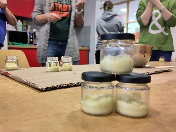 Gesagt, getan. Unsere wunderbare Imkerin Kristina hat jetzt bereits zum dritten Mal den Workshop „Allzweckcreme und Lippenbalsam“ in unseren Räumen angeboten. Die gut besuchte Runde vermischte Deckelwachs, Jojobaöl, Rosenwasser und andere hochwertige Bestandteile, um ebenso hochwertige Pflegeprodukte herzustellen. Dazu gab es Kaffee, Kuchen und Lebkuchen. Es gibt schlechtere Nachmittage. Vielen Dank, Kristina!