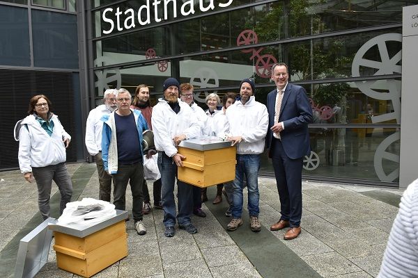 ... und das sogar sehr gerne. Und zwar mit Anhang. Drei unserer Ableger haben nämlich genau dort am vergangenen Montag ein neues Domizil gefunden: Das Dach des neuen Stadthauses in der Großen Bleiche. Oberbürgermeister und Projektschirmherr Michael Ebling begrüßte die neuen Bewohnerinnen samt Akteure herzlich und betonte die ökologische und soziale die Bedeutung unseres Projektes für die Stadt Mainz. Natürlich braucht der „Stadthaus“-Honig auch noch einen Namen – warum nicht im Rahmen eines Wettbewerbes? Mehr dazu demnächst…