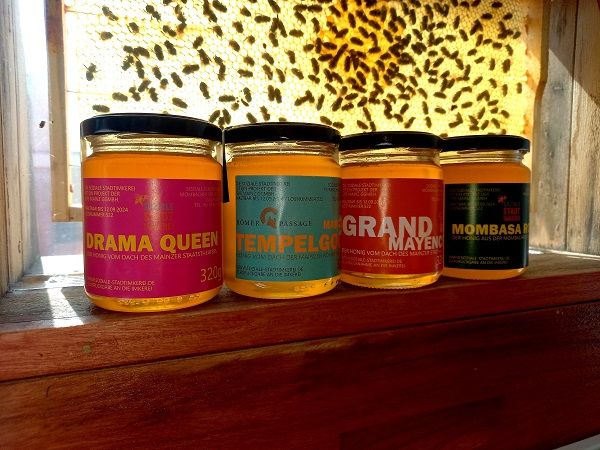 Wir verkünden feierlich: Die erste Frühtracht 2022 ist geschleudert, abgefüllt und mit unseren schicken Etiketten geschmückt. Ab Dienstag, den 31. Mai ist unser Stadthonig in der Stadtimkerei, Mombacher Straße 78, erhältlich. Wir haben Honige von den Standorten Römerpassage (TEMPELGOLD), Mombacher Straße (MOMBASA ROYAL), Staatstheater / Kleines Haus (DRAMA QUEEN) und Stadthaus Große Bleiche (GRAND MAYENCE) im Angebot. Er schmeckt köstlich, Versprochen!