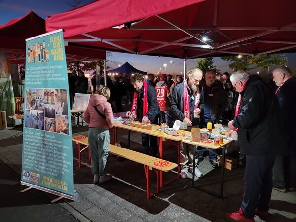 Beim Heimspiel der 05ER gegen Borussia Mönchengladbach standen Klima- und Umweltthemen ganz besonders im Fokus. Verschiedene Umweltinitiativen wie beispielsweise auch der NABU präsentierten auf der Aktionsfläche direkt vorm Stadion ihre Arbeit. Am Stand der Sozialen Stadtimkerei konnte Honig der MEWA-Arena (übrigens keine 100m vom Stand entfernt) verkostet werden. Dazu wurden fleißig Buttons – zum Beispiel mit verschiedenen Wildbienen-Motiven - gepresst.