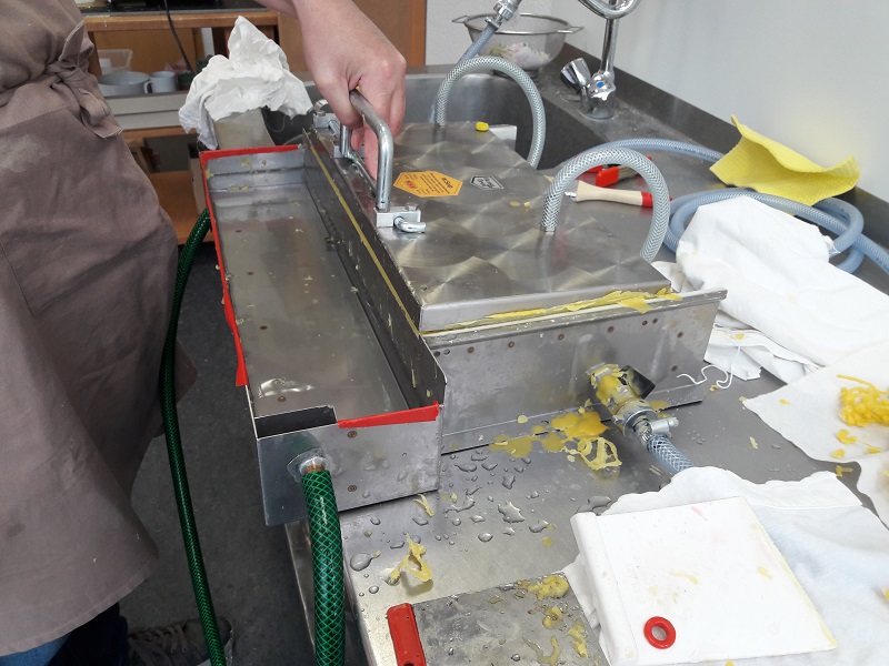 Schöne Neuigkeiten für alle Imkerinnen und Imker: Wir gießen nun auch Mittelwände. Eigenes Wachs bei uns abgeben und nach ein paar Tagen Mittelwände abholen. Unsere Gerätschaften werden vor dem nächsten Einschmelzen komplett gereinigt, so dass Ihr auch tatsächlich nur Mittelwände aus Eurem eigenen Wachs erhaltet. Wir nehmen nur gereinigtes Wachs und wären Euch sehr dankbar, wenn die Wachsstücke einen Durchmesser von max. 24 cm hätten. Das Wachs wird bei uns auf max. 90 °C erhitzt. Wir gießen auf Zandermaß für 8 € pro kg geliefertes Wachs. Aus einem Kilo Bienenwachs können wir ungefähr 14 Mittelwände gießen.
